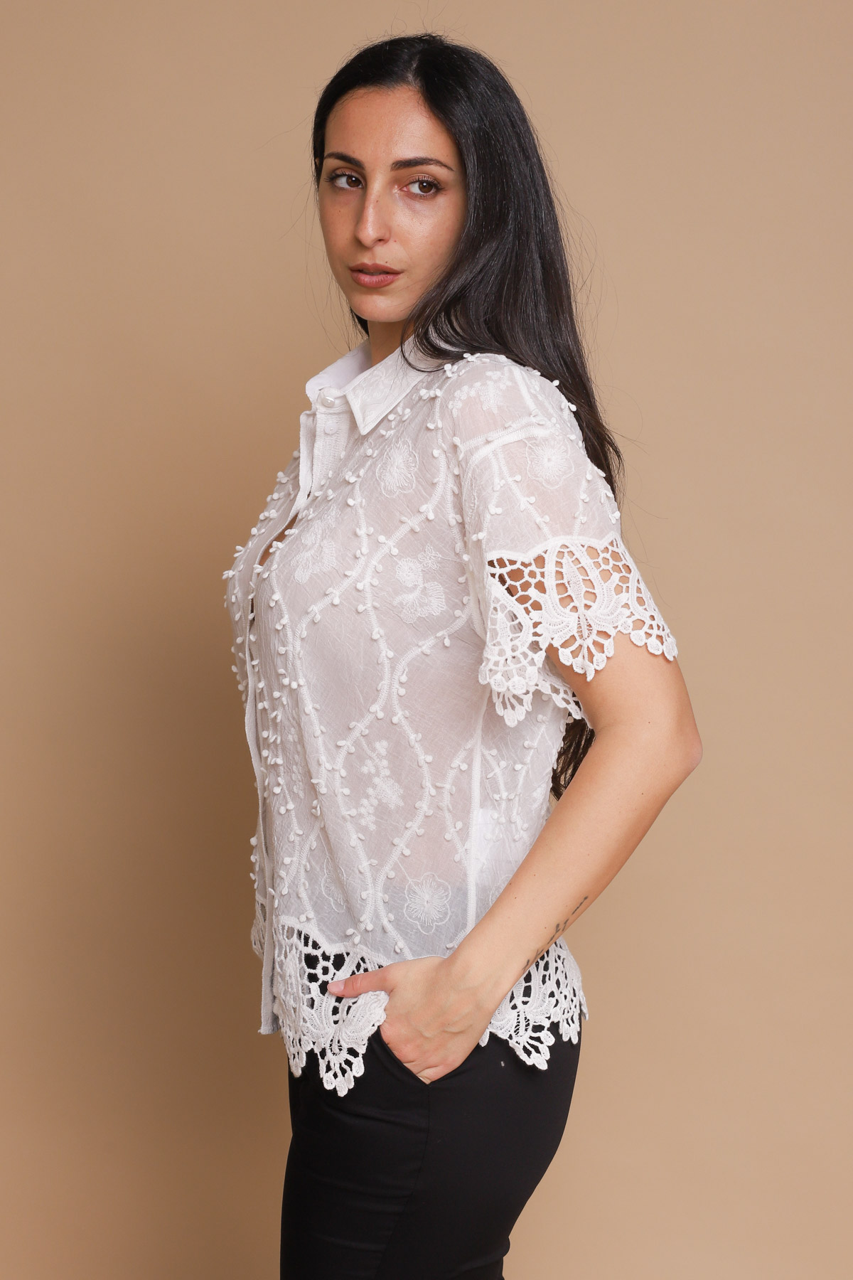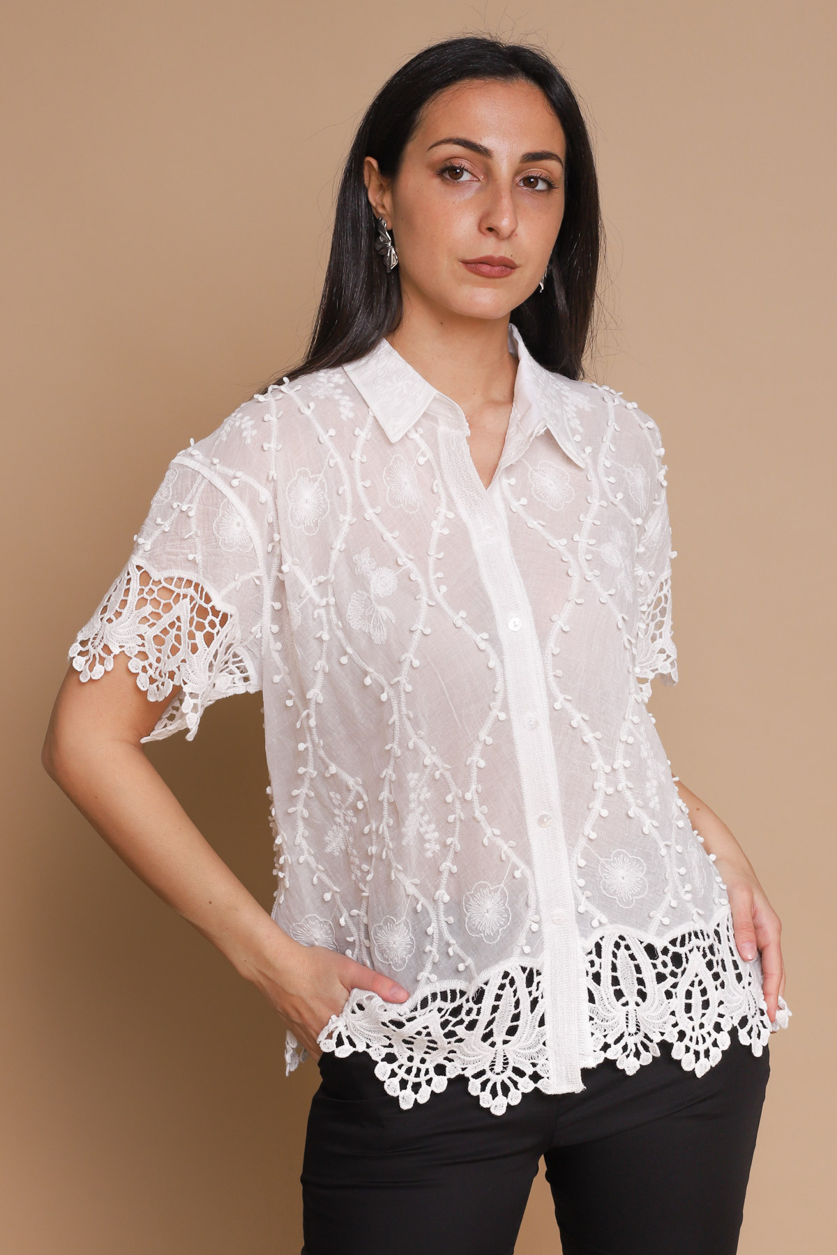 CAMICIA CON PIZZO E RICAMI IN PURO COTONE